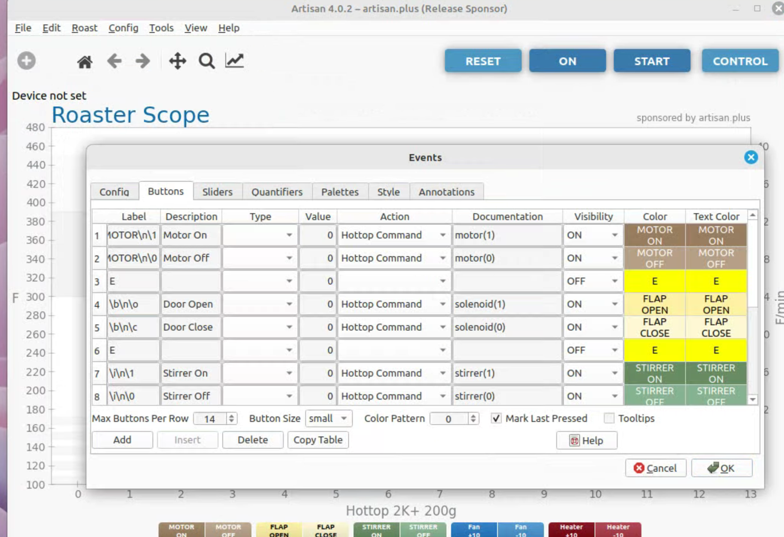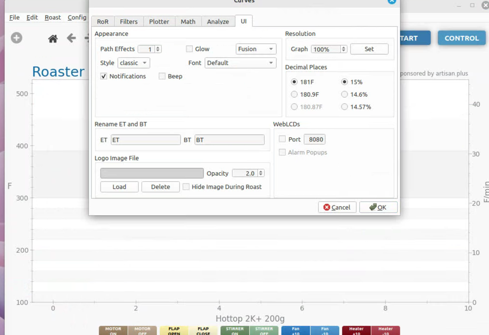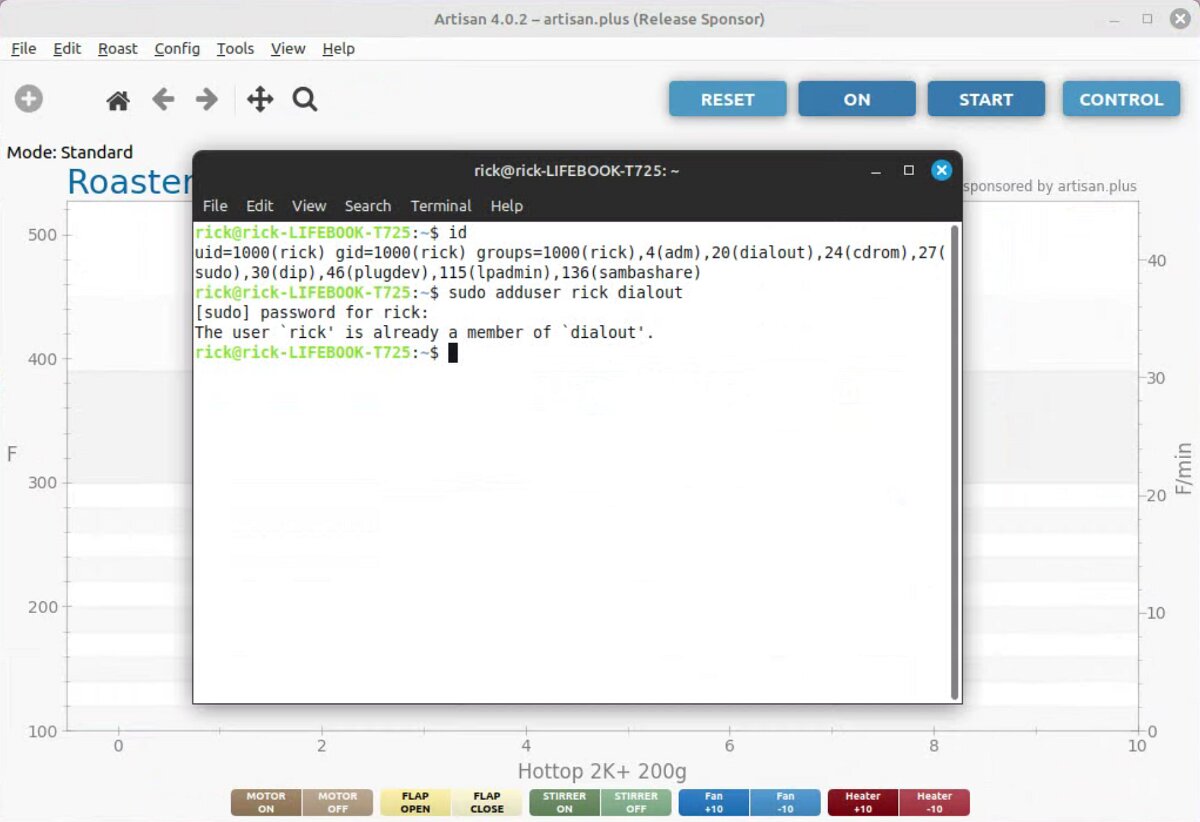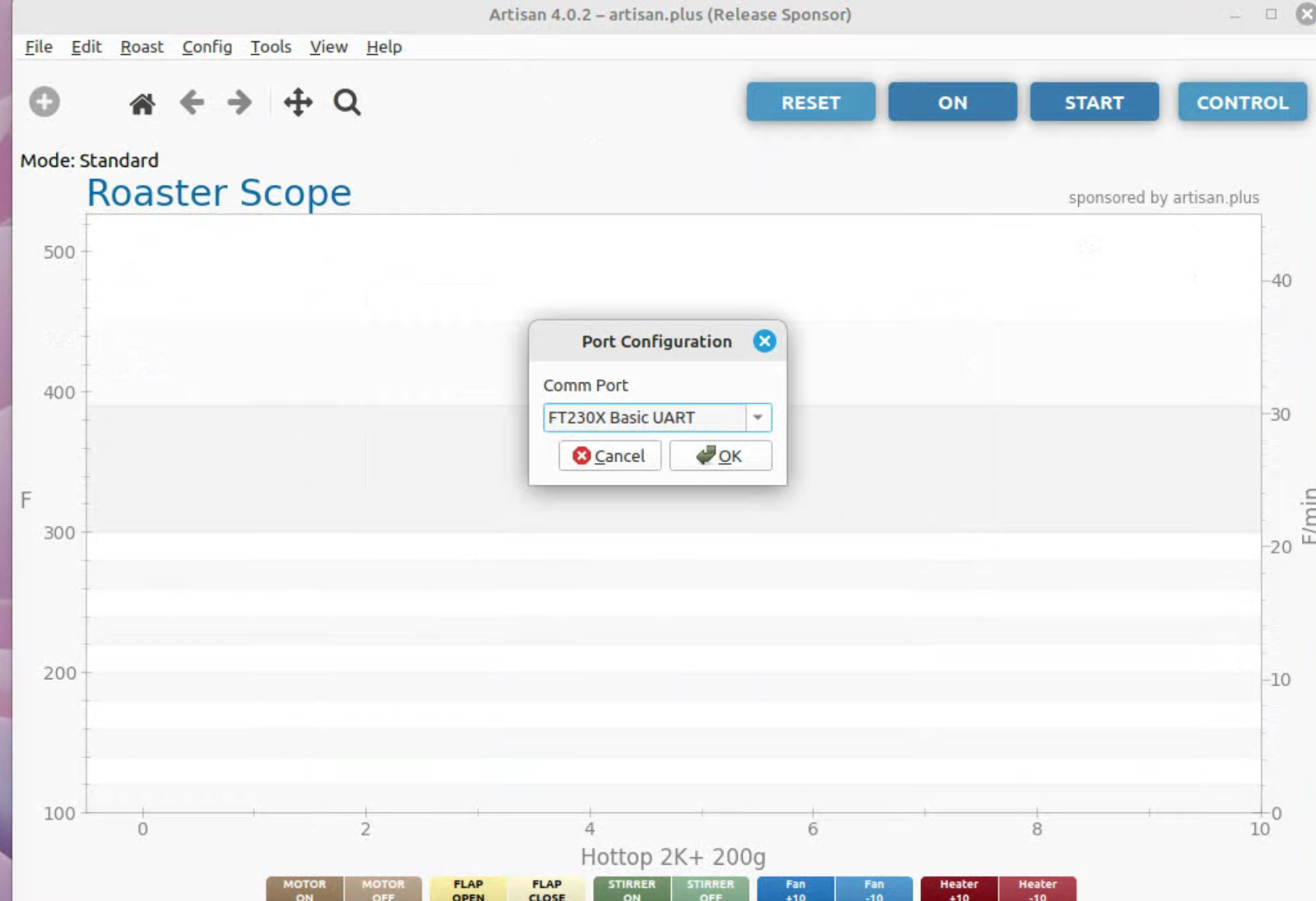 To run artisan under Linux - must add user to dialout group Start with factory reset, then config roaster Config / Machine for Hottop B-2K+ Correct port for my B-2K is F230X Basic UART Config / Machine - with no changes, success Config / Autosave - Set up file naming and location Limited menu options under Standard Mode Only see all menu options under Expert Mode Change sampling rate to three seconds Config / Curves / ROR - turn off projection of ROR Config / Curves / Filters - change smoothing Config / Curves / UI - Remove decimal places Config / Axes Config / Device / Extra Devices eliminate LCD display for fan and heater Config / Device / Symb ET/BT - offset 4 degrees to match OLD B-2K+ Config / Events / Config - change default buttons and disable auto-DROP Config / Events / Buttons do NOT change Config / Events / Buttons do NOT change Config / Events / Sliders change STEP to 10 for heater Config / Events / Quantifiers change STEP to 10 for heater