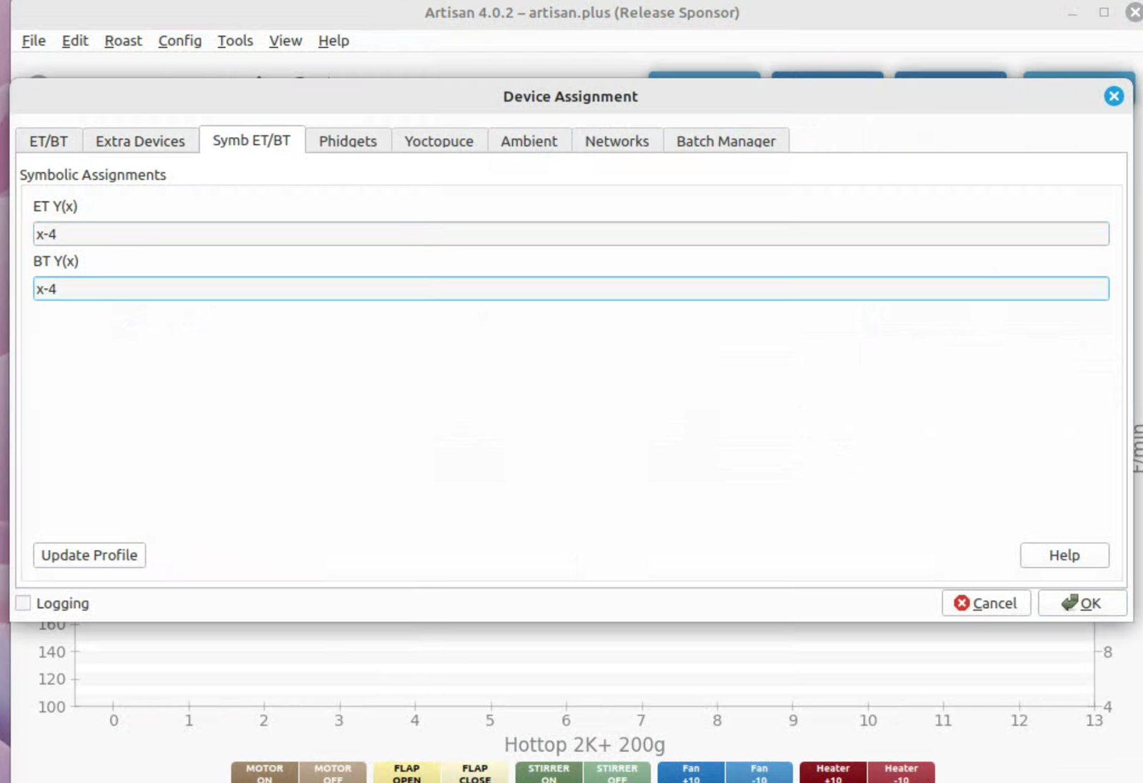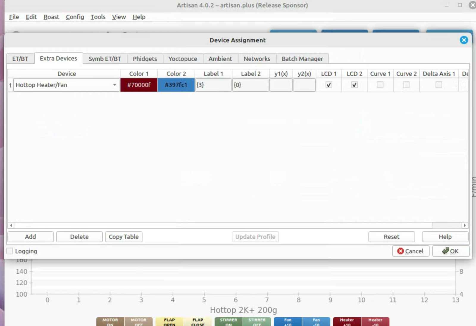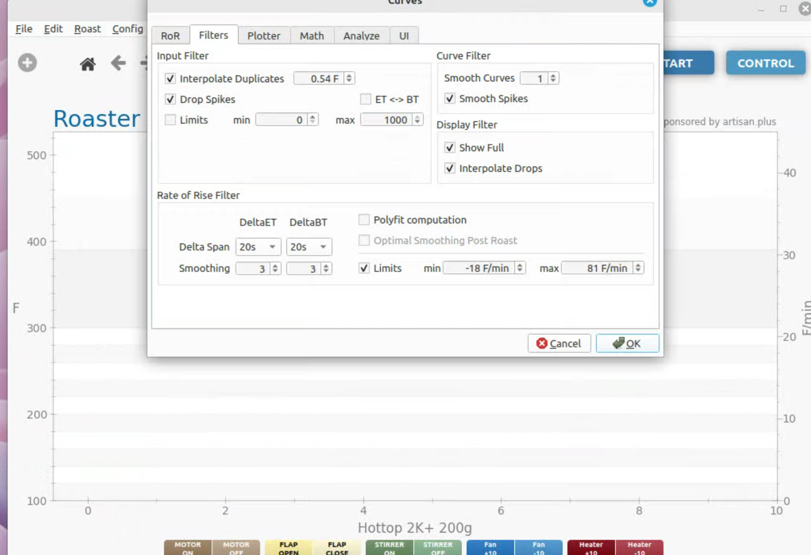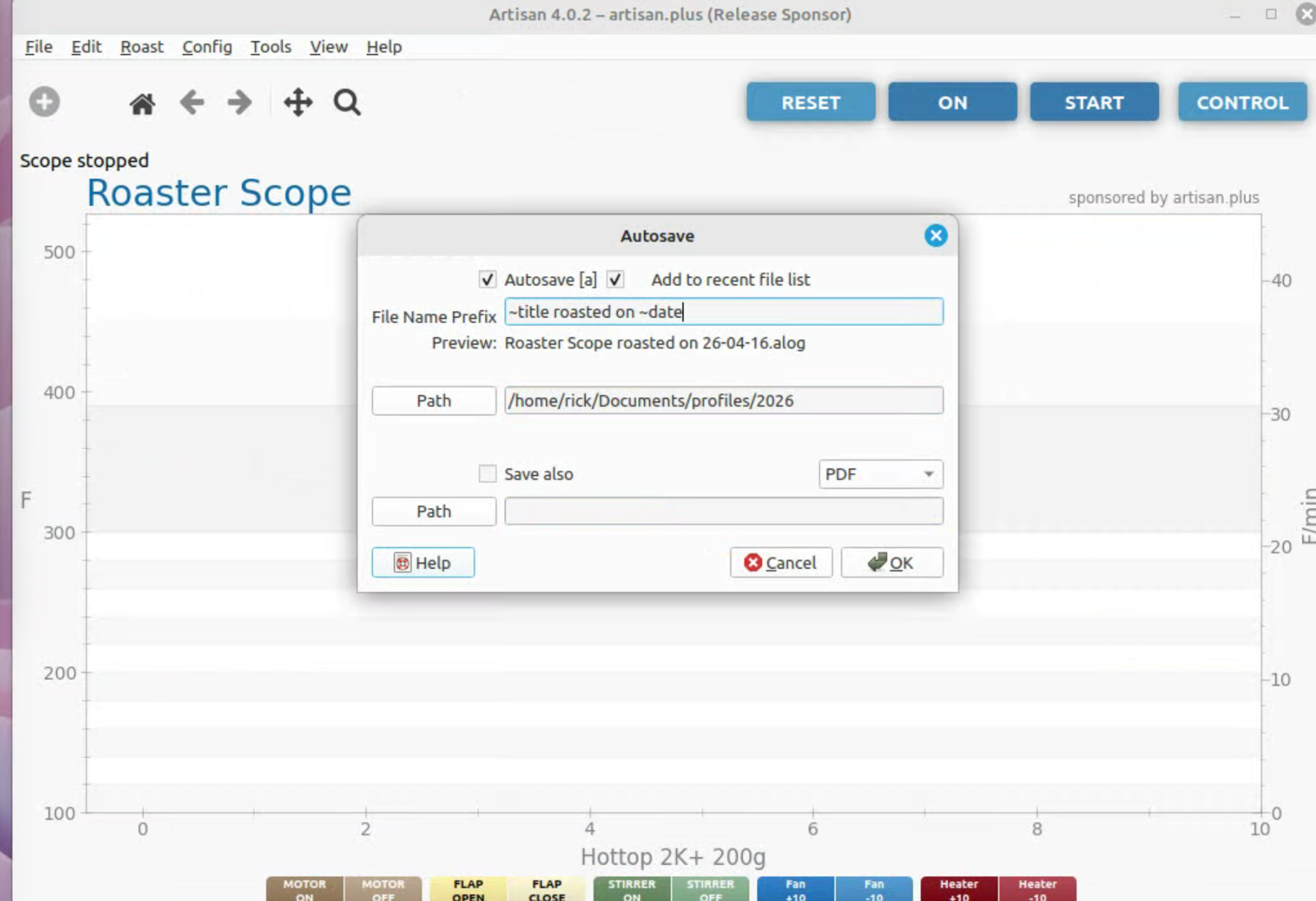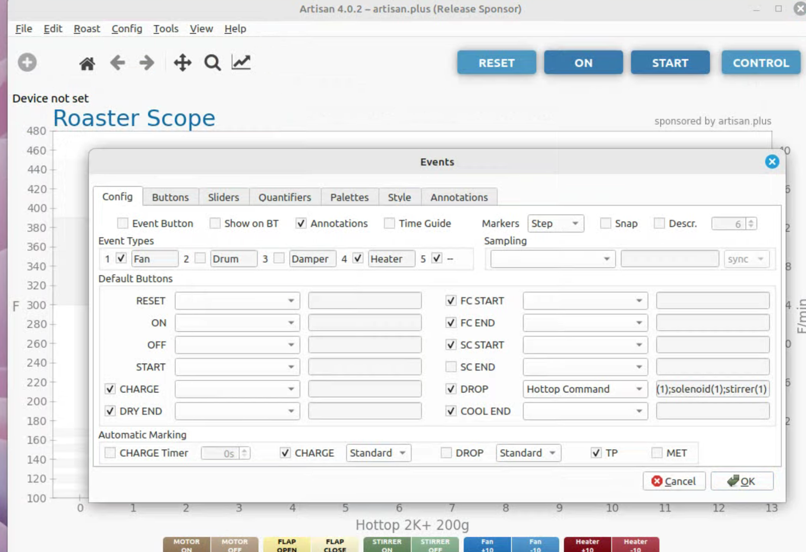 To run artisan under Linux - must add user to dialout group Start with factory reset, then config roaster Config / Machine for Hottop B-2K+ Correct port for my B-2K is F230X Basic UART Config / Machine - with no changes, success Config / Autosave - Set up file naming and location Limited menu options under Standard Mode Only see all menu options under Expert Mode Change sampling rate to three seconds Config / Curves / ROR - turn off projection of ROR Config / Curves / Filters - change smoothing Config / Curves / UI - Remove decimal places Config / Axes Config / Device / Extra Devices eliminate LCD display for fan and heater Config / Device / Symb ET/BT - offset 4 degrees to match OLD B-2K+ Config / Events / Config - change default buttons and disable auto-DROP Config / Events / Buttons do NOT change Config / Events / Buttons do NOT change Config / Events / Sliders change STEP to 10 for heater Config / Events / Quantifiers change STEP to 10 for heater
