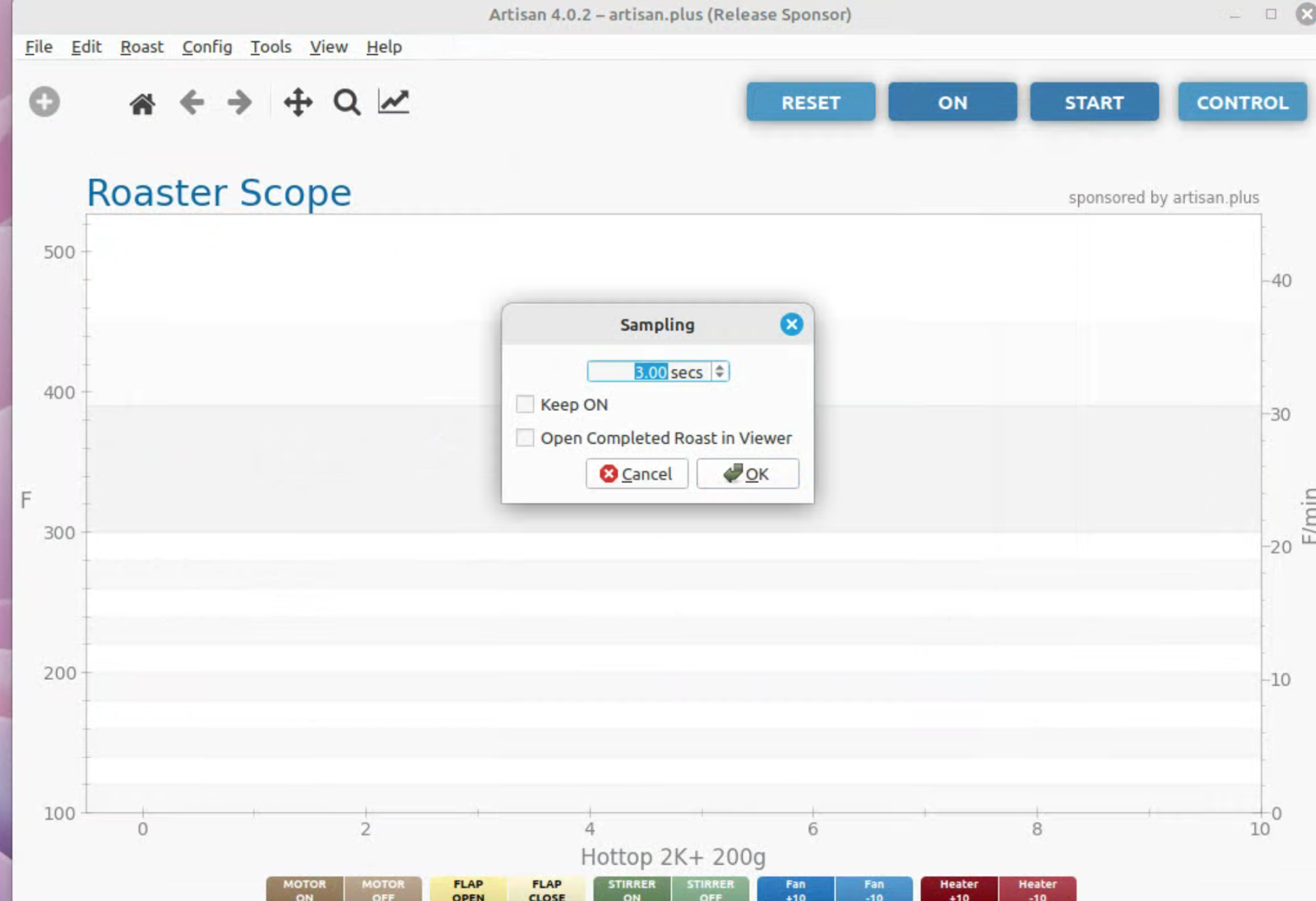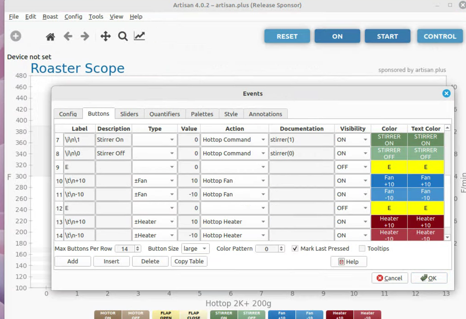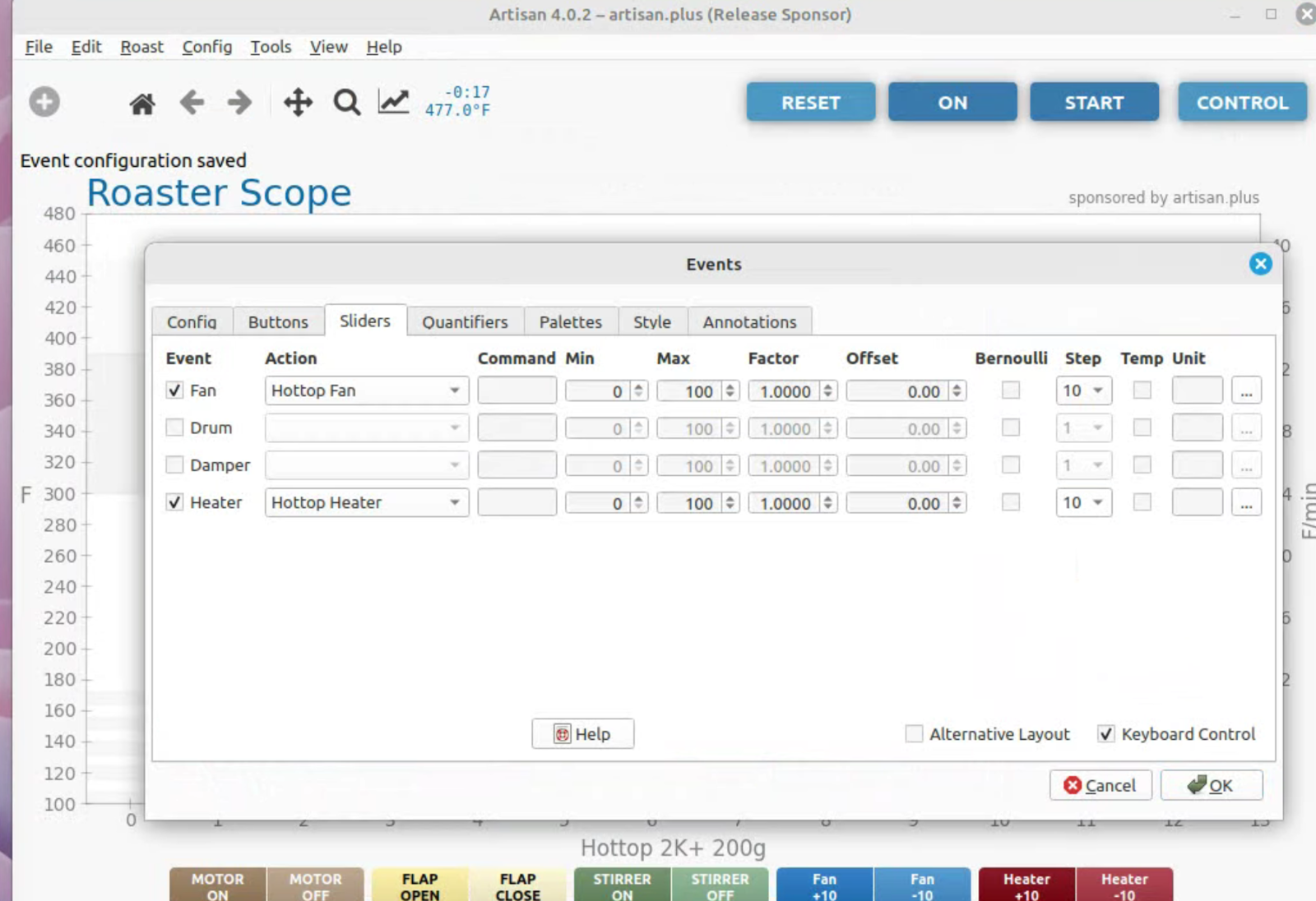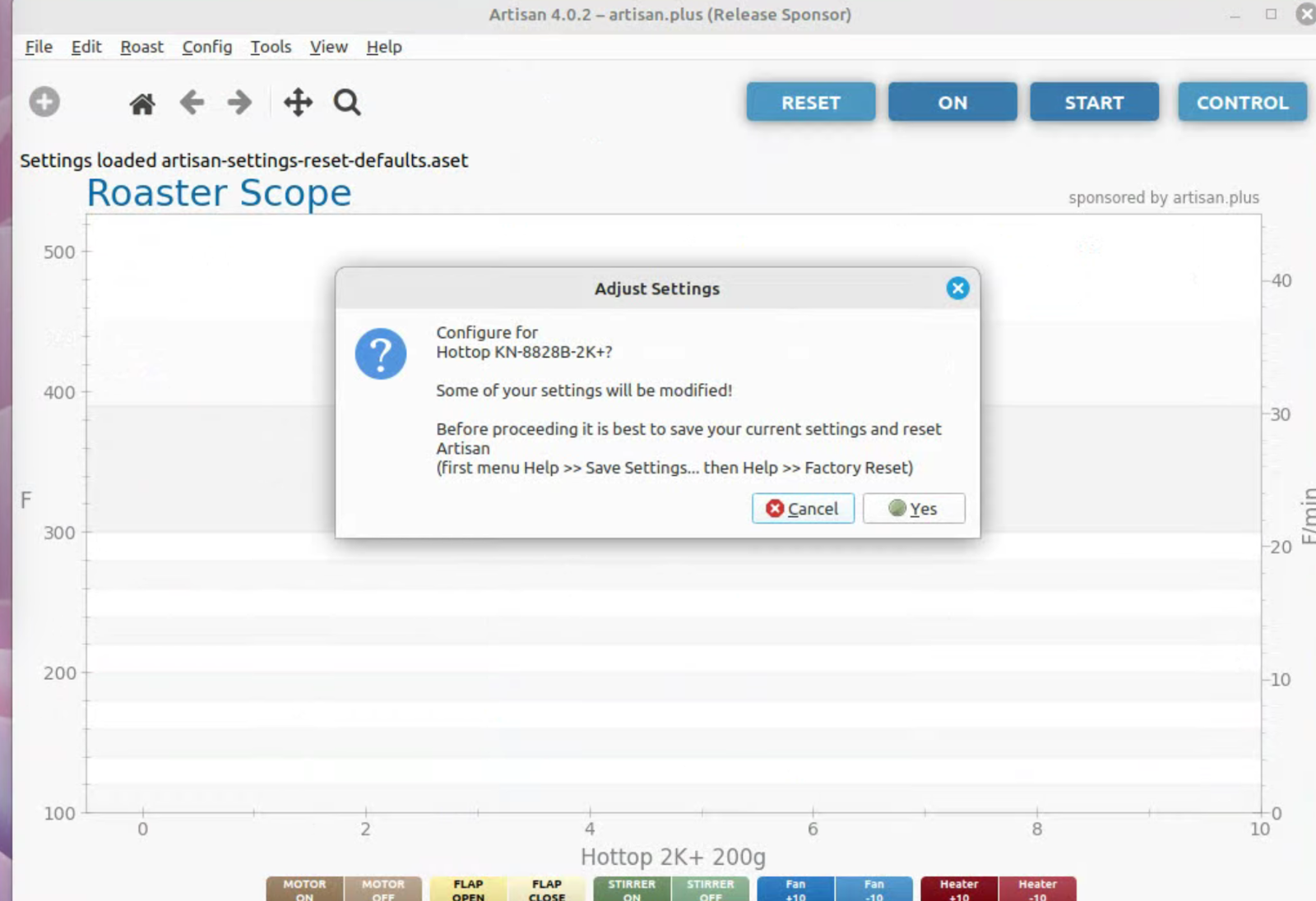 To run artisan under Linux - must add user to dialout group Start with factory reset, then config roaster Config / Machine for Hottop B-2K+ Correct port for my B-2K is F230X Basic UART Config / Machine - with no changes, success Config / Autosave - Set up file naming and location Limited menu options under Standard Mode Only see all menu options under Expert Mode Change sampling rate to three seconds Config / Curves / ROR - turn off projection of ROR Config / Curves / Filters - change smoothing Config / Curves / UI - Remove decimal places Config / Axes Config / Device / Extra Devices eliminate LCD display for fan and heater Config / Device / Symb ET/BT - offset 4 degrees to match OLD B-2K+ Config / Events / Config - change default buttons and disable auto-DROP Config / Events / Buttons do NOT change Config / Events / Buttons do NOT change Config / Events / Sliders change STEP to 10 for heater Config / Events / Quantifiers change STEP to 10 for heater