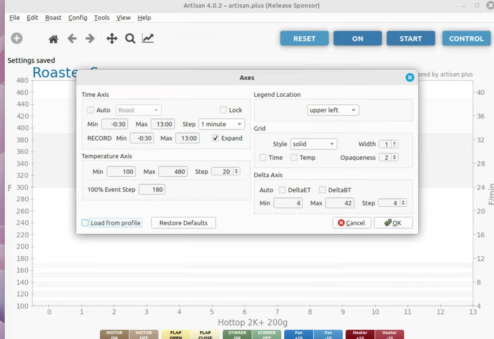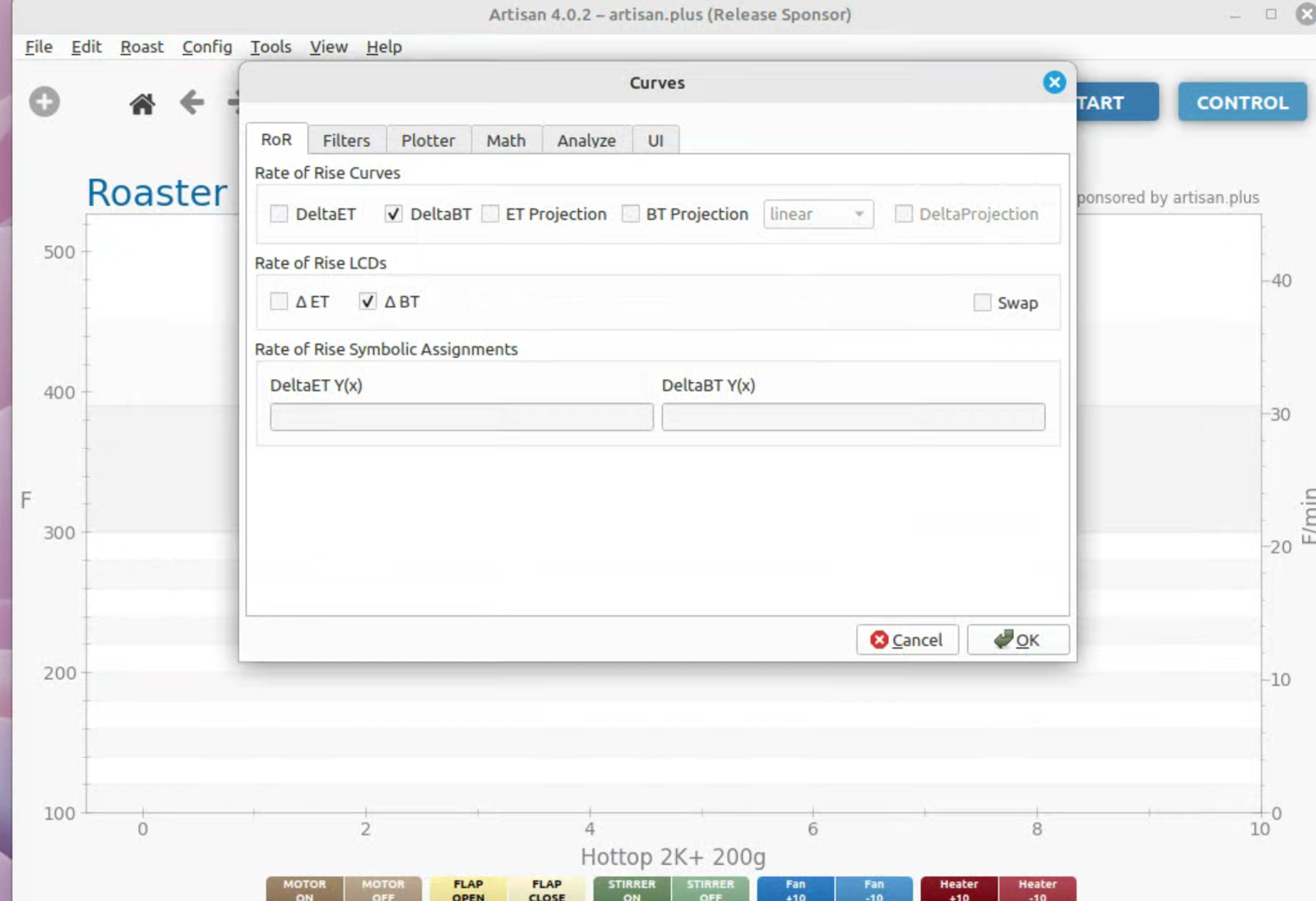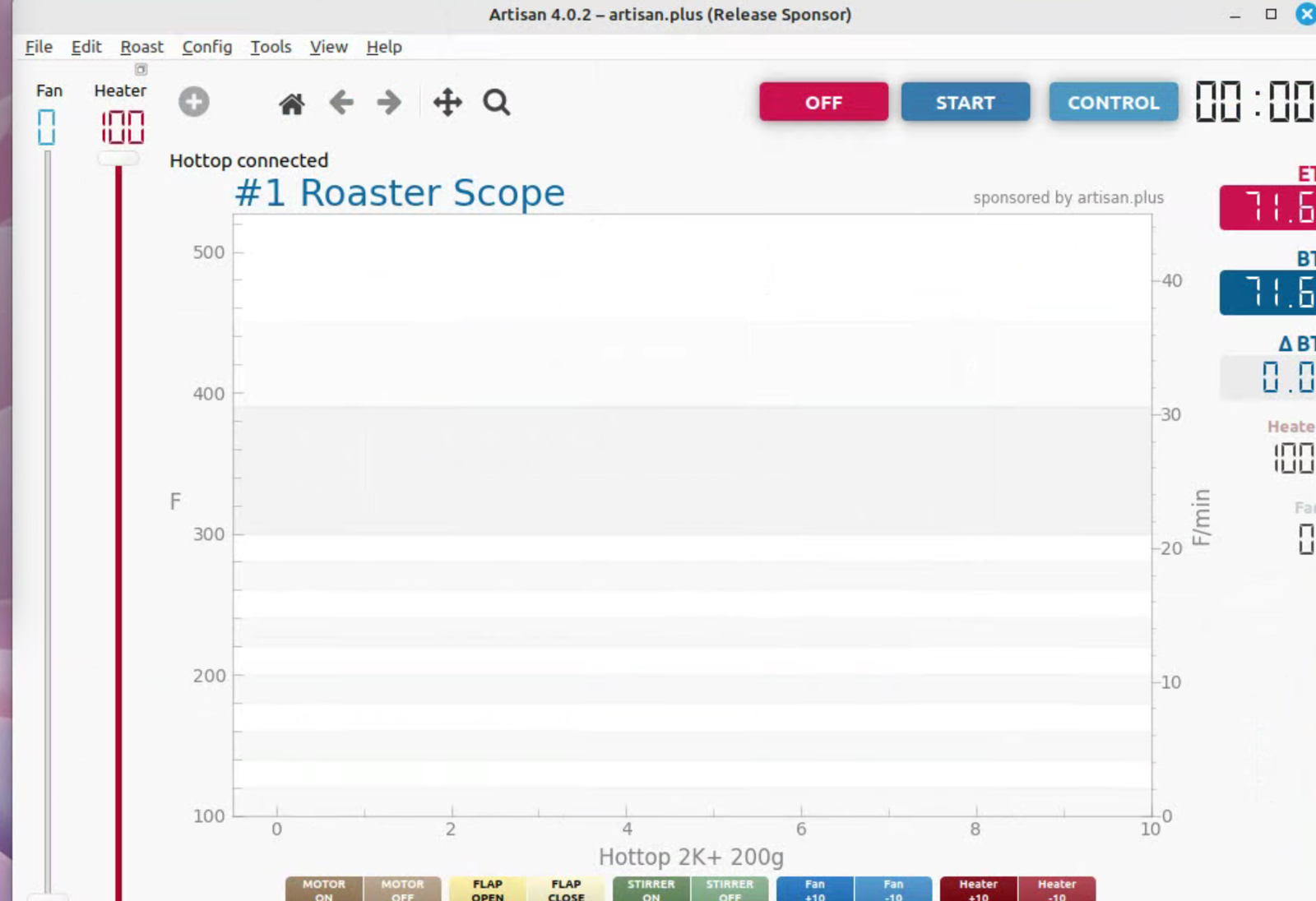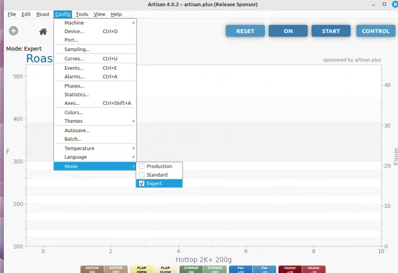 To run artisan under Linux - must add user to dialout group Start with factory reset, then config roaster Config / Machine for Hottop B-2K+ Correct port for my B-2K is F230X Basic UART Config / Machine - with no changes, success Config / Autosave - Set up file naming and location Limited menu options under Standard Mode Only see all menu options under Expert Mode Change sampling rate to three seconds Config / Curves / ROR - turn off projection of ROR Config / Curves / Filters - change smoothing Config / Curves / UI - Remove decimal places Config / Axes Config / Device / Extra Devices eliminate LCD display for fan and heater Config / Device / Symb ET/BT - offset 4 degrees to match OLD B-2K+ Config / Events / Config - change default buttons and disable auto-DROP Config / Events / Buttons do NOT change Config / Events / Buttons do NOT change Config / Events / Sliders change STEP to 10 for heater Config / Events / Quantifiers change STEP to 10 for heater
