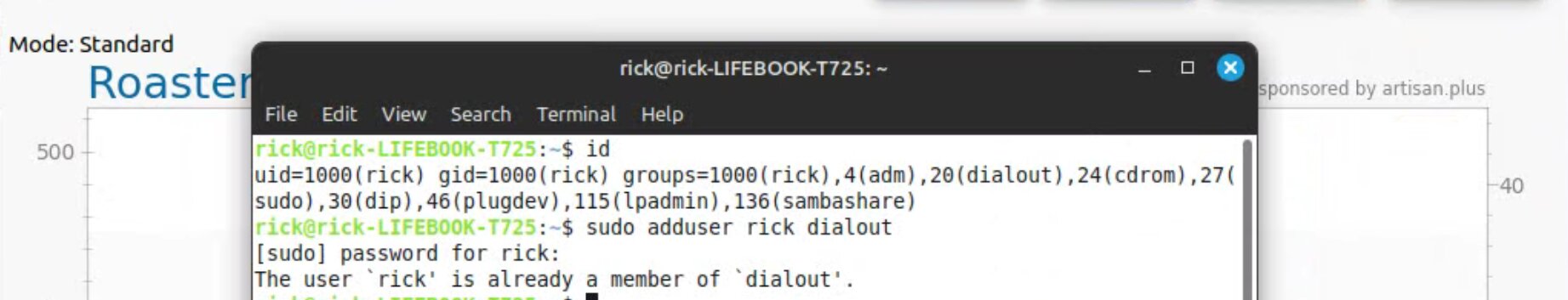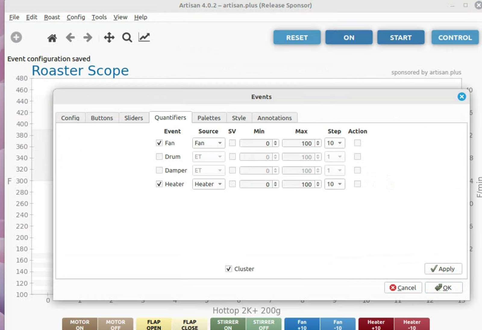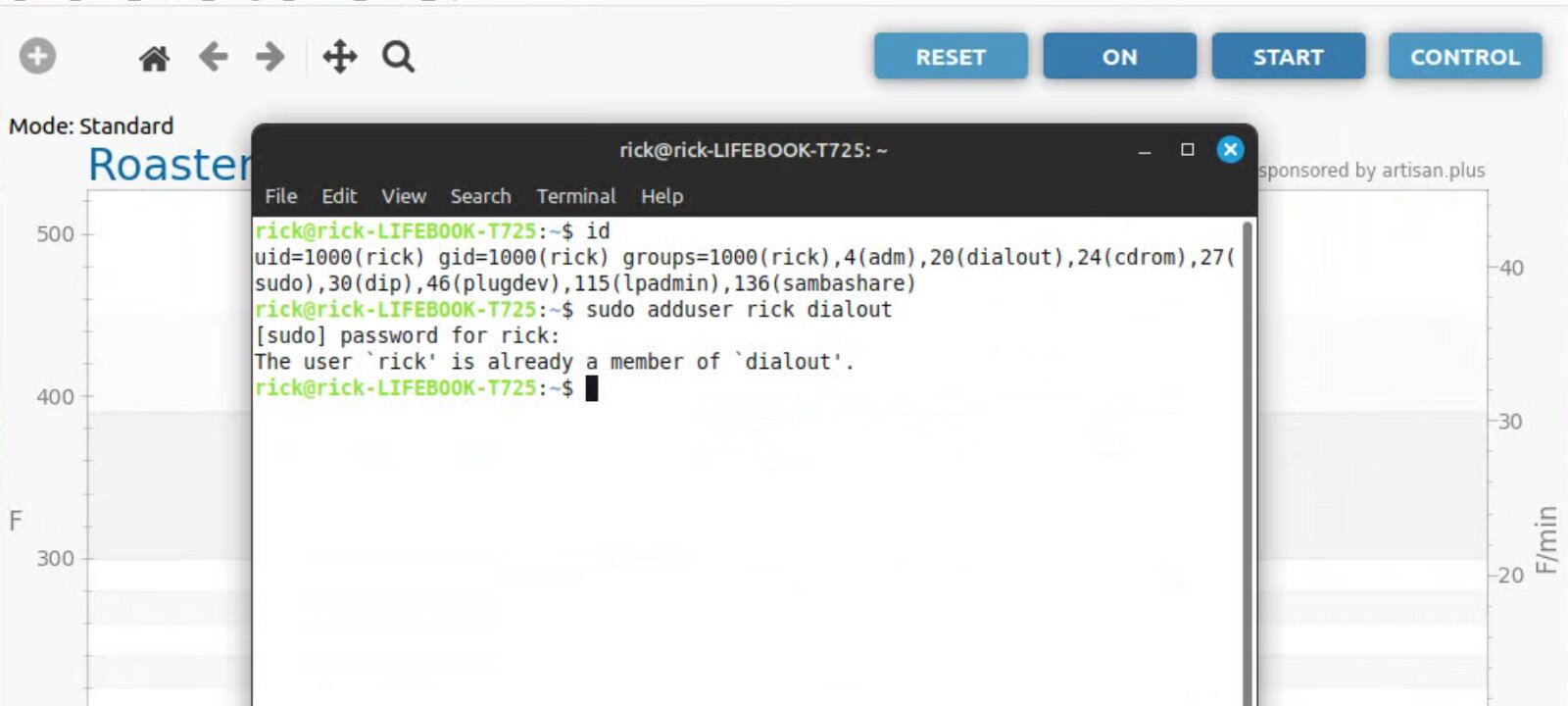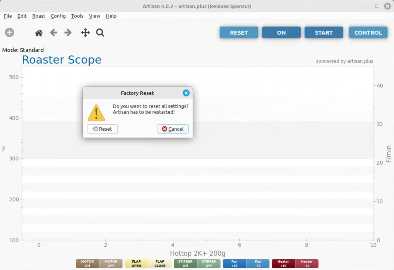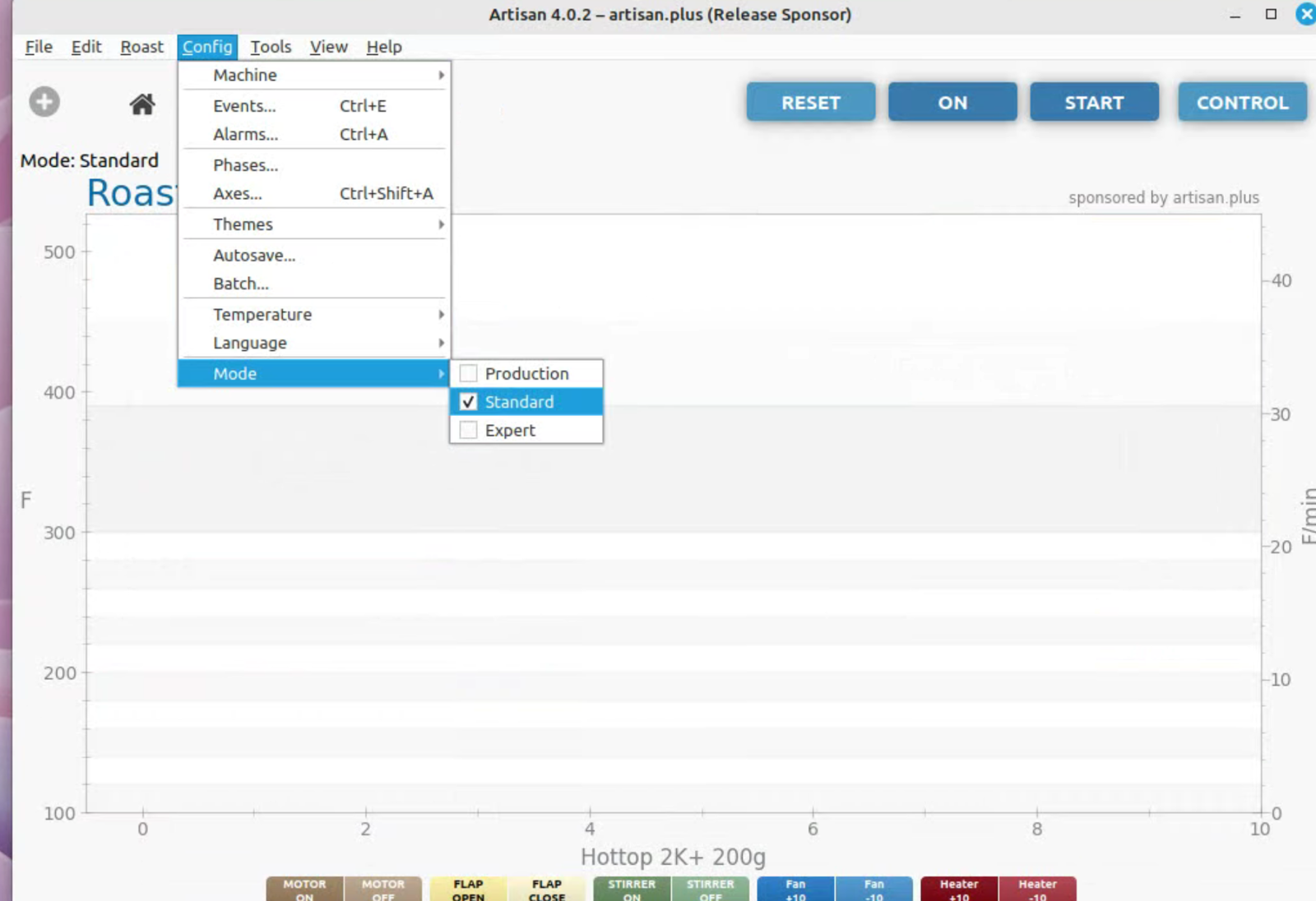 To run artisan under Linux - must add user to dialout group Start with factory reset, then config roaster Config / Machine for Hottop B-2K+ Correct port for my B-2K is F230X Basic UART Config / Machine - with no changes, success Config / Autosave - Set up file naming and location Limited menu options under Standard Mode Only see all menu options under Expert Mode Change sampling rate to three seconds Config / Curves / ROR - turn off projection of ROR Config / Curves / Filters - change smoothing Config / Curves / UI - Remove decimal places Config / Axes Config / Device / Extra Devices eliminate LCD display for fan and heater Config / Device / Symb ET/BT - offset 4 degrees to match OLD B-2K+ Config / Events / Config - change default buttons and disable auto-DROP Config / Events / Buttons do NOT change Config / Events / Buttons do NOT change Config / Events / Sliders change STEP to 10 for heater Config / Events / Quantifiers change STEP to 10 for heater