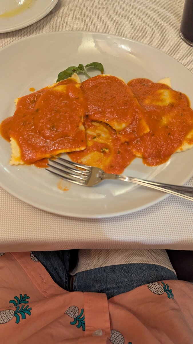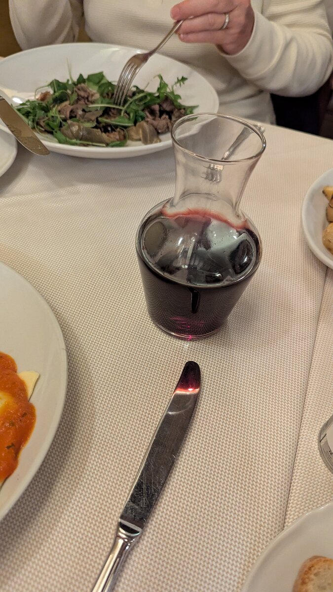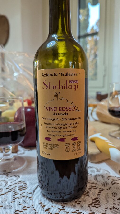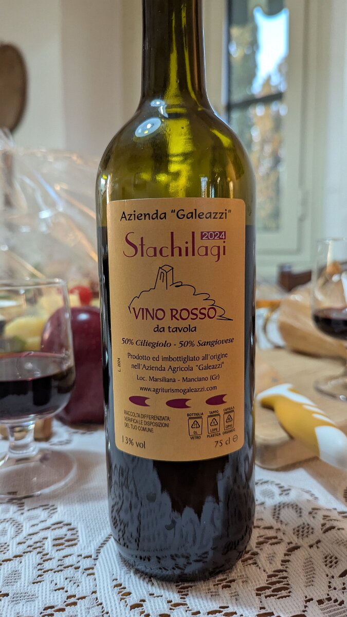 Really good local wine in our villa in Manciano African antelope above the hearth Manciano is a hilltop town, a 10 minute walk from the villa Beautiful scenery from our porch Panorama via Bimostitch app Dinner in Manciano Great Ravioli Fancy local olive oil 10-1010-12