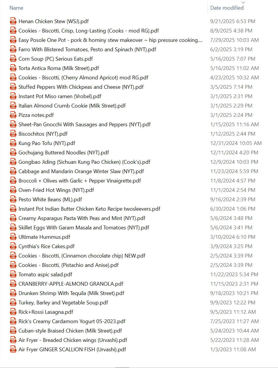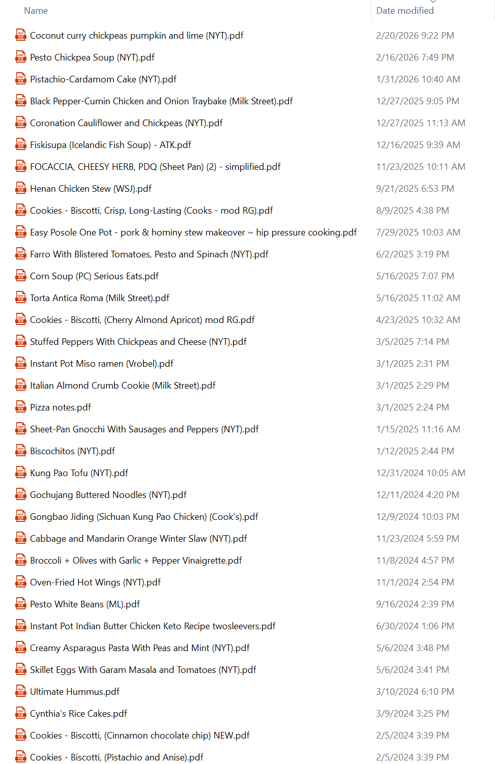 Many recent recipes come from Cook’s Illustrated magazine, or Milk Street magazine.
